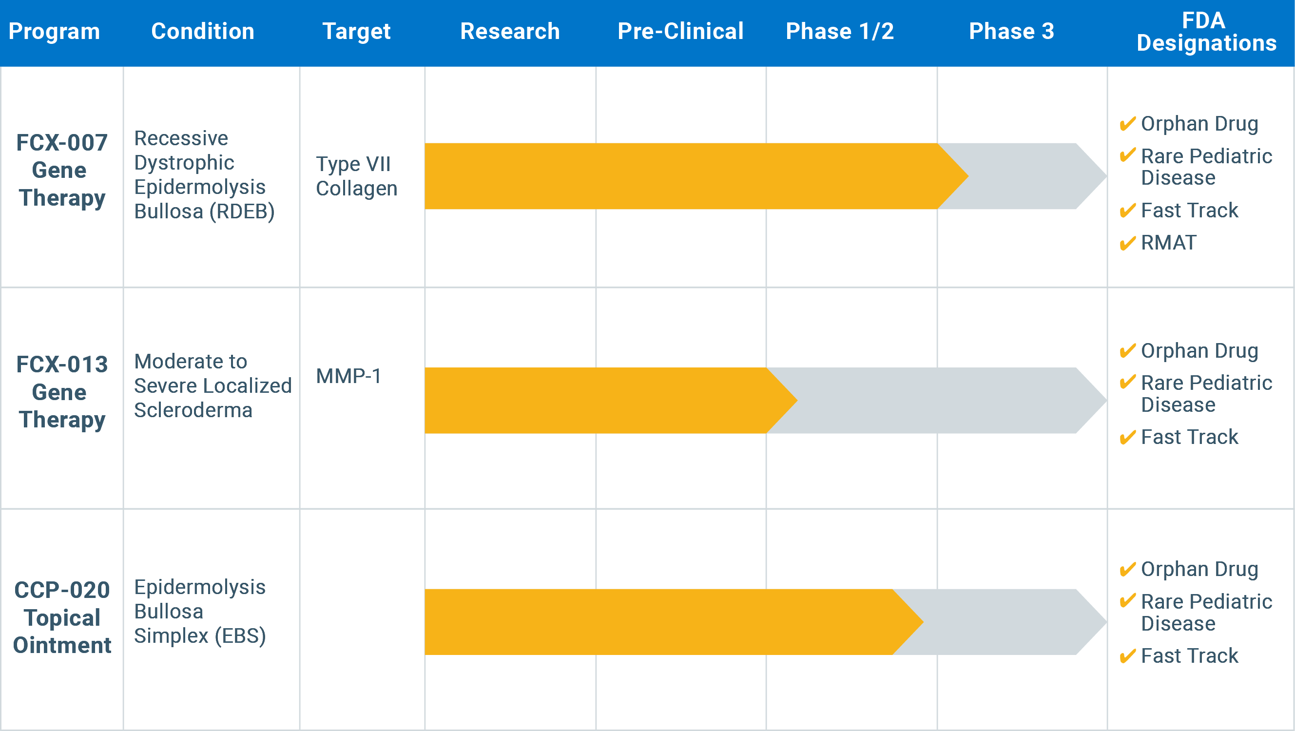 据悉,这些投资中的部分资金将用于支持针对RDEB的FCX-007三期临床试验(NCT04213261),该临床试验将在至多20名患有RDEB的儿童、青少年和成人中开展,其试验目标为,相比传统标准疗法,FCX-007与标准疗法共同使用是否能改善伤口愈合。目前,该项临床试验正由位于奥斯汀的Dell Children 's Medical Group招募患者,未来还有两家临床试验中心待开放。Castle Creek计划于 2021 年,在美国寻求FCX-007的监管批准。