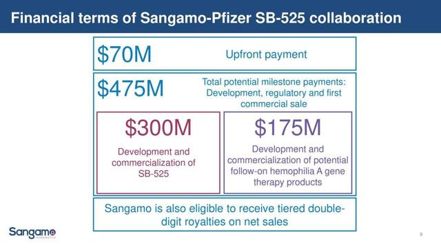Sangamo在与辉瑞的合作中已经收到了针对SB-525的7000万美元预付款,此外还可能获得高达3亿美元的里程碑式付款,用于SB-525的开发和商业化。除此之外,该公司还将获得1.75亿美元的其他A型血友病相关产品的资金。