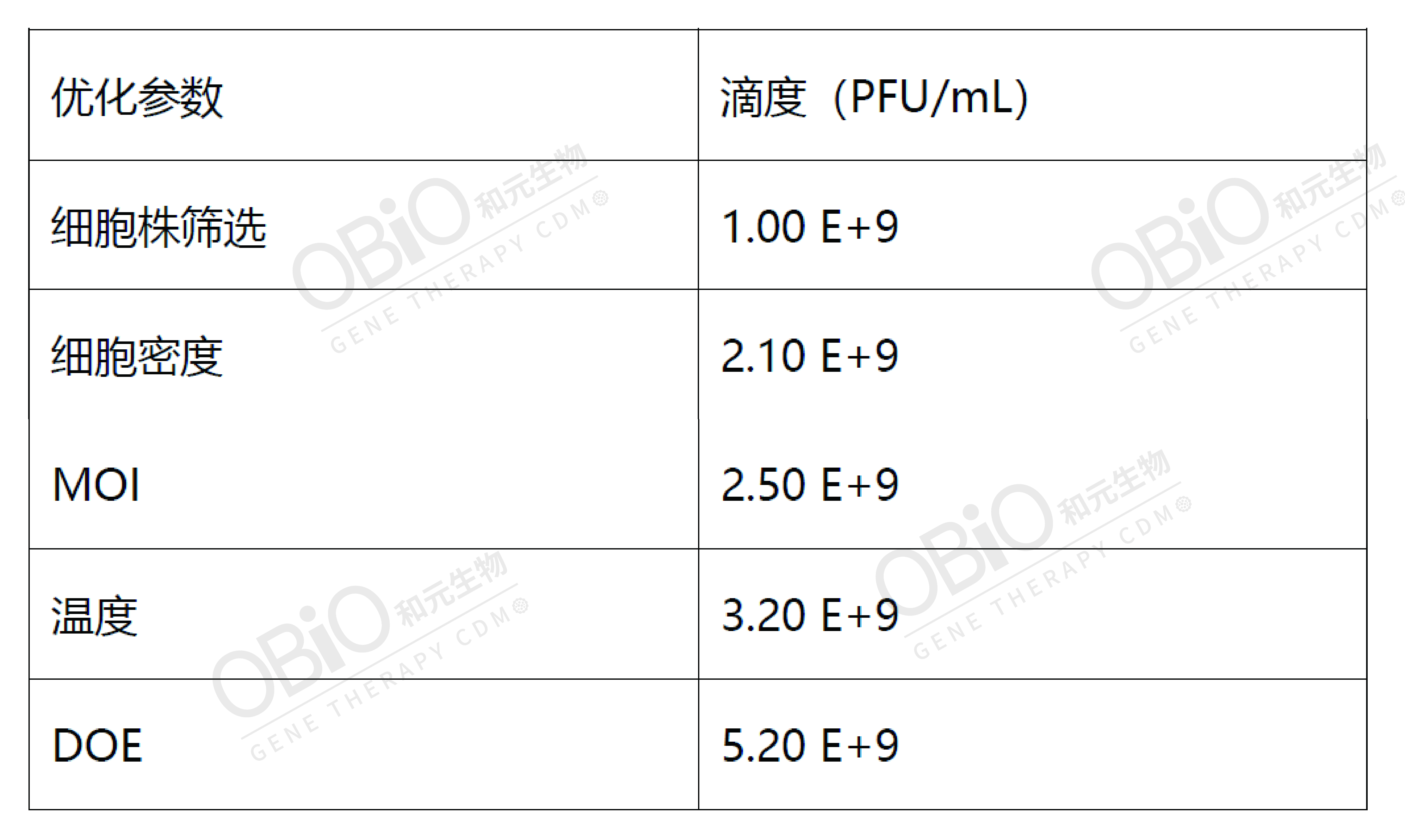 以重组腺病毒为例,采用无血清悬浮293细胞培养,经过多个关键因素的优化,滴度从最初的1.00 E+9 PFU/mL 提高至5.20 E+9 PFU/mL,产量提高约5倍,有效实现大规模无血清悬浮培养腺病毒载体。