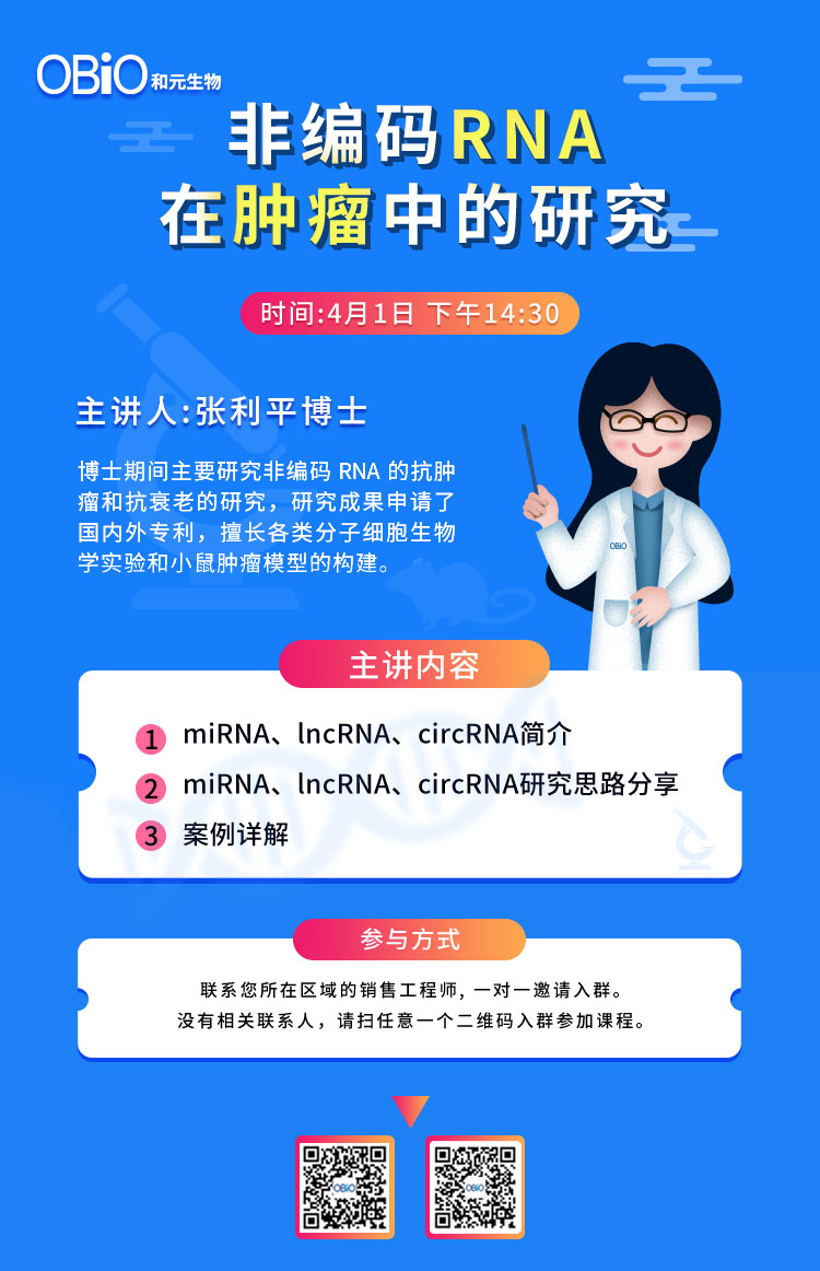 因此,j9九游会官方讲师团队特聘顾问专家再次出击,和各位老师共探miRNA、lncRNA、circRNA的研究思路展开分享,让你快速深入了解非编码RNA在肿瘤中的研究思路,时间依然是4月1日14:30,等你们来。