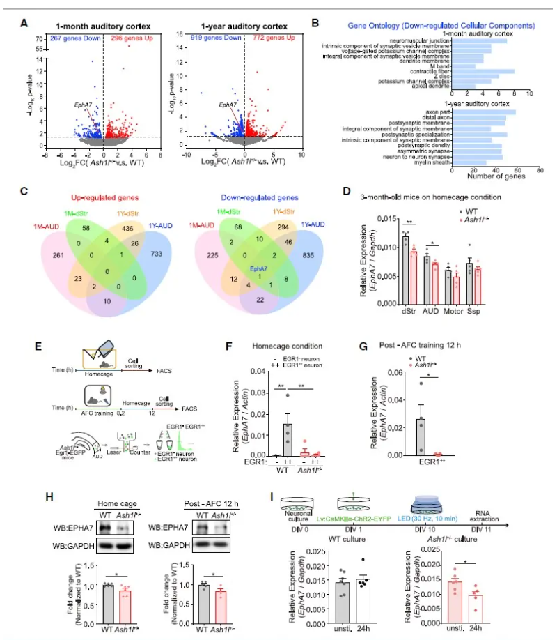 随后,研究人员借助音调依赖的恐惧条件行为学范式,在体内/体外均发现Ash1l+/-小鼠听觉皮层活动依赖的神经元中EphA7表达远低于WT小鼠的(图4D-I),提示了在Ash1l+/-小鼠中EphA7活动诱导表达受损。