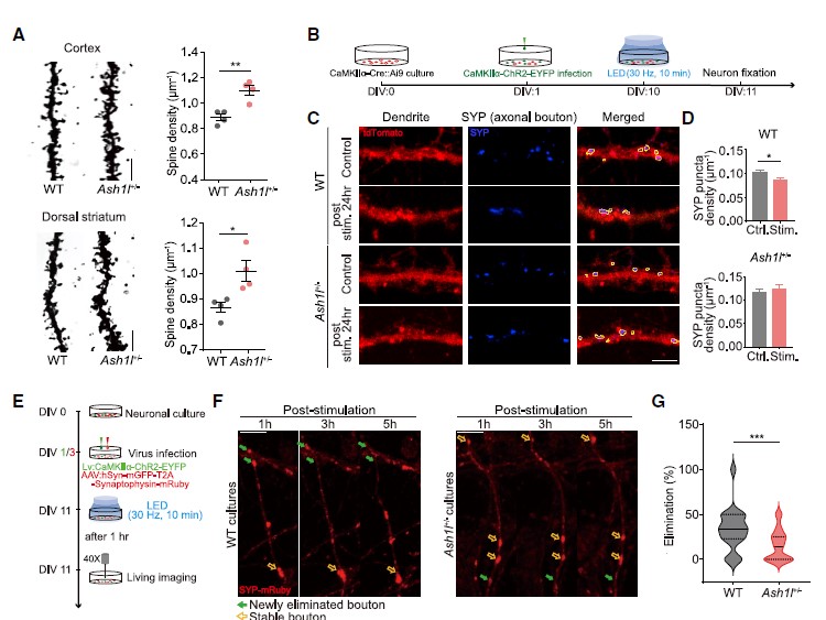 随后,作者借助高尔基染色发现,1月龄的Ash1l+/-小鼠皮层神经元和背侧纹状体中棘神经元(MSNs)的树突棘密度显著增加(图3A),为研究这种现象是否源于突触消除过程(synapse elimination)的减少,研究人员研究了Ash1+/-小鼠原代皮层神经元的突触密度变化。用表达ChR2光敏蛋白的慢病毒载体(Lenti-CaMKIIa-ChR2)感染培养的神经元,并用LED刺激(图3B),发现WT神经元在LED刺激后24h树突突触素(SYP)密度显著降低,而Ash1l+/-组则未观察到这种现象(图3C,D),提示了Ash1l可能介导了活动依赖的突触修剪过程。活体成像结果显示,Ash1l+/-组培养的神经元中,活性依赖的突触消除过程被削弱。