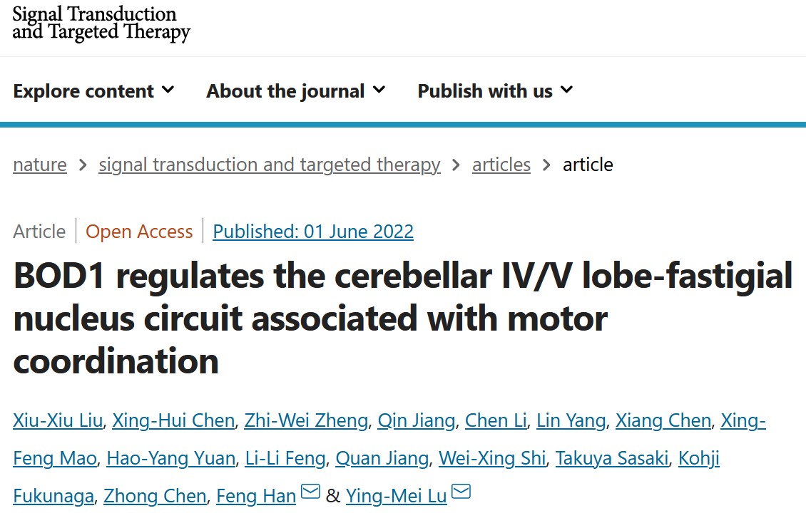 2022年6月1日,南京医科大学基础医学院卢应梅教授课题组与药学院韩峰教授课题组合作在Signal Transduction and Targeted Therapy杂志在线发表最新研究论文“BOD1 regulates the cerebellar IV/V lobe-fastigial nucleus circuit associated with motor coordination”。此项研究首次报道了小脑IV/V叶到小脑顶核(Fastigial Nucleus,FN)投射环路异常是导致共济失调发生的重要病因之一,揭示了基于BOD1相关信号通路所导致的小脑IV/V叶浦肯野神经元至其下游投射的小脑顶核谷氨酸能神经元环路(IV/V lobePCs—FNCaMKIIα+)异常在共济失调发生发展过程中的分子机制。为探索预防共济失调等相关运动系统疾病的神经调控手段及临床治疗的分子药物靶点开发提供了强有力的依据。