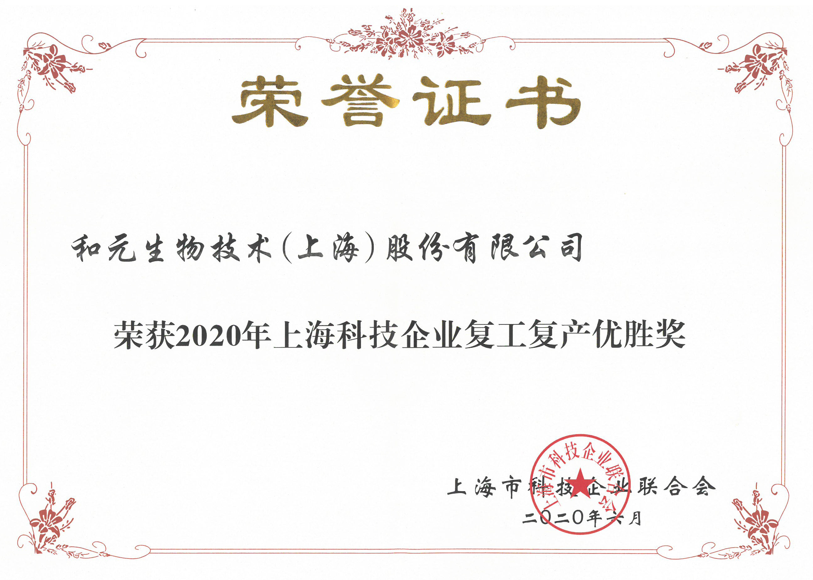 2020年6月22日,在市科技企业联合会举办的“迎七一、抗疫情、献爱心”表彰会上,中国-九游·会J9官方网站|真人游戏第一品牌 荣获“2020年上海科技企业复工复产优胜奖”。