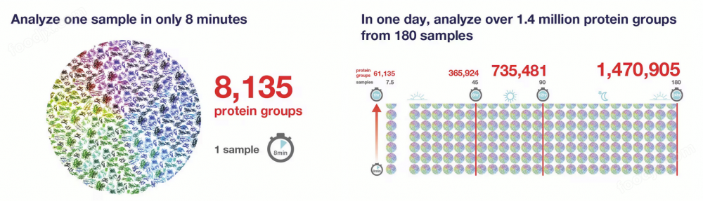 能够在一天内分析 180 个样品,而且每个样品可以定量 8,000 多个蛋白质组。单日可定量分析 140 多万个蛋白质组数据点,高通量进样循环只需 8 分钟。