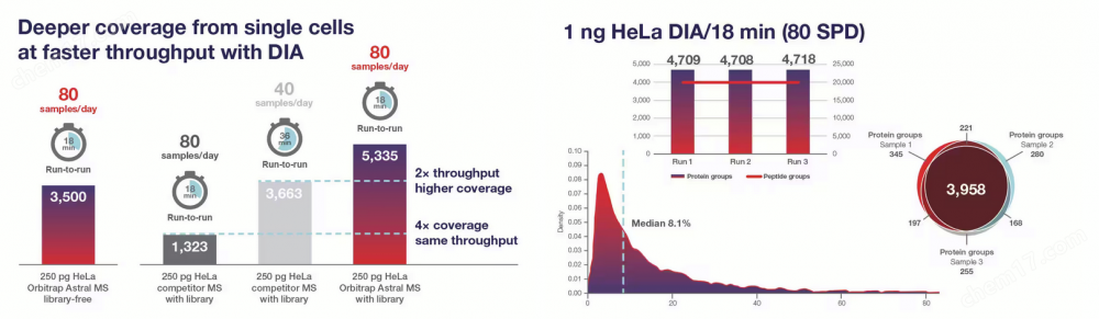 生物学的复杂性和异质性需要定量分析较少数量的细胞群或单个细胞。蛋白质组的动态范围很广,不仅可以定量分析高丰度蛋白质,而且可以检测低至数个拷贝的蛋白质。Orbitrap Astral 质谱仪扩展了大体积样品到只有200个拷贝/细胞水平样品的蛋白质定量分析的动态范围。Orbitrap Astral 质谱仪可以定量分析等量单细胞样品中的 5,000 多种蛋白质,并且针对大队列样品,只需数百个拷贝即可准确定量蛋白质。