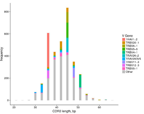对CDR3 V/J基因序列长度分布情况进行统计,图中横坐标为CDR3(V Gene)碱基序列长度,纵坐标为对应的clonotype name频率,不同颜色表示不同V Gene,top10的V Gene用彩色表示,other(灰色部分)表示其他V Gene。