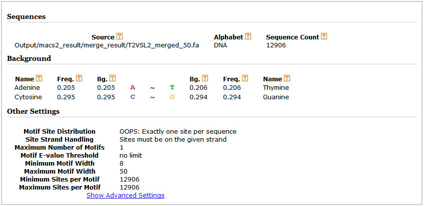 RNA甲基化修饰以及去甲基化修饰起始于多种结合蛋白与发生甲基化位点的Motif相结合。Motif本质上是一种具有生物意义的核酸序列模式,这些RNA甲基化相关的酶可识别这些Motif并与之结合,从而影响基因的表达。基因表达调控机制研究是生物学研究的重点内容,鉴定这些motif,对于基因表达调控机制研究具有重要意义。 使用Motif分析软件MEME在peak区域寻找可信度较高的motif,得到每个Motif的宽度、E-value、PFM、PSSM以及其在各个peak序列总的位置信息等等。