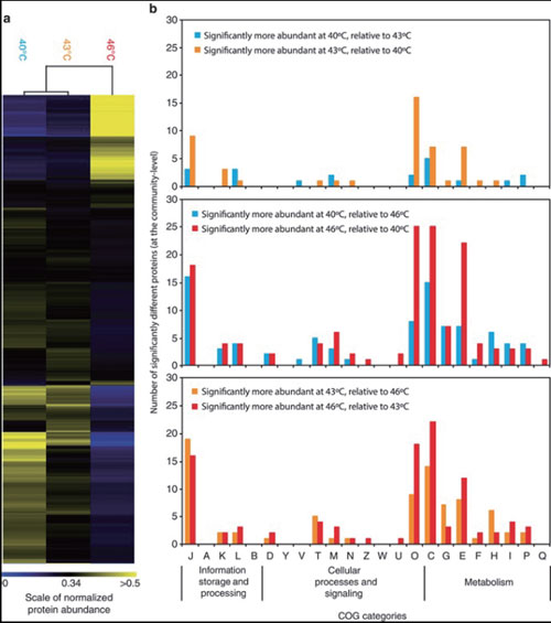 本文首次将TMT标记定量蛋白质组学技术应用在微生物群落研究上,精确地和可重复地在40℃、43℃和46℃三个温度条件下定量到上千个微生物蛋白质。作者发现,温度升高会引起单个微生物和整个群落的氨基酸代谢相关蛋白质上调,并抑制两类螺菌属微生物的固碳蛋白表达,然而在高温下第三类螺菌属微生物固碳蛋白则显著上调。