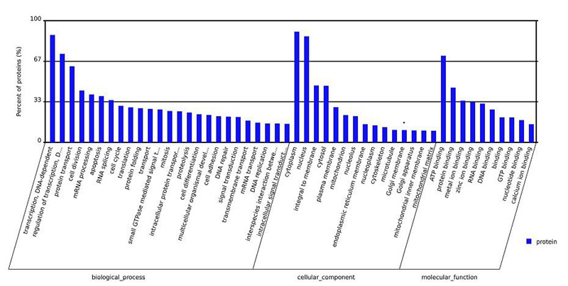 GO分为三个功能:生物进程(biological process) 细胞组成(cellular component)分子功能(molecular function)。一般进行分析时,会 取前50个差异较为明显的蛋白绘制GO注释图。分别对应这三个功能的差 异蛋白数量为25个,15个以及10个。