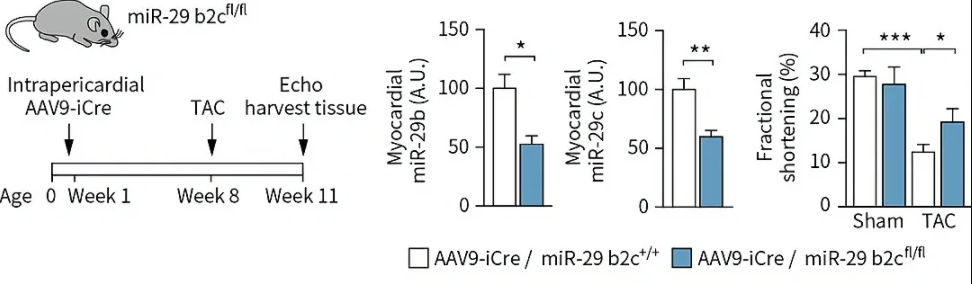 scAAV即自互补AAV,弥补了rAAV病毒载体表达较慢的缺点,感染3天后即可表达,同时可长时间稳定表达。德国慕尼黑工业大学Stefan Engelhardt研究团队[4],利用scAAV-iCre对miR-29 b2cfl/fl 小鼠心肌细胞的miR-29 b2c进行特异性敲除。