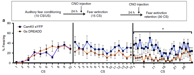 1、Thy1-Cre鼠配合AAV-DIO- DREADD病毒载体,操纵杏仁核BLA区Thy1阳性细胞改变恐惧记忆的消退和维持