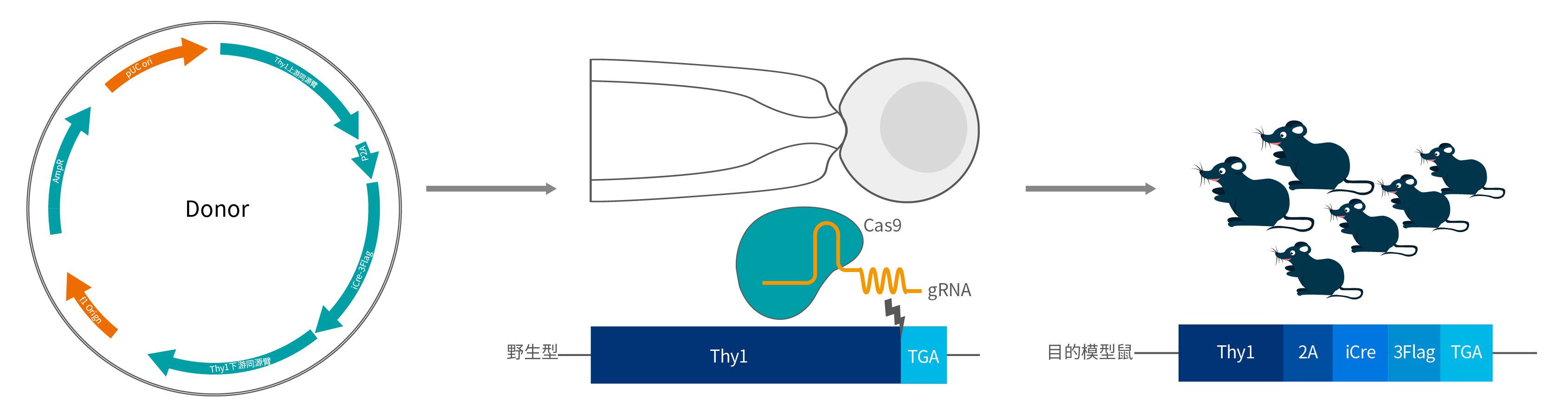 利用基因敲入手段,借助CRISPR/Cas9技术,将Cre重组酶定点插入到小鼠基因组中,获得可特异性在某类神经元中表达Cre的工具鼠,从而可以配合AAV-DIO病毒载体,做到精准操控神经元的目的,亦可以和多种Flox鼠搭配使用,研究不同基因的功能。