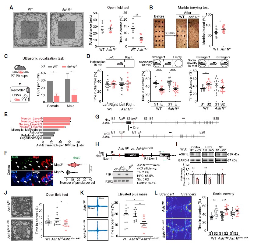 基于上述结果,作者构建Ash1lEmx1-cKO小鼠(特异性在前脑,特别是新皮层和海马区敲除Ash1l,图1G-I),并通过行为学范式发现,前脑Ash1l单倍体不足导致小鼠ASD样行为(图1J-L)。