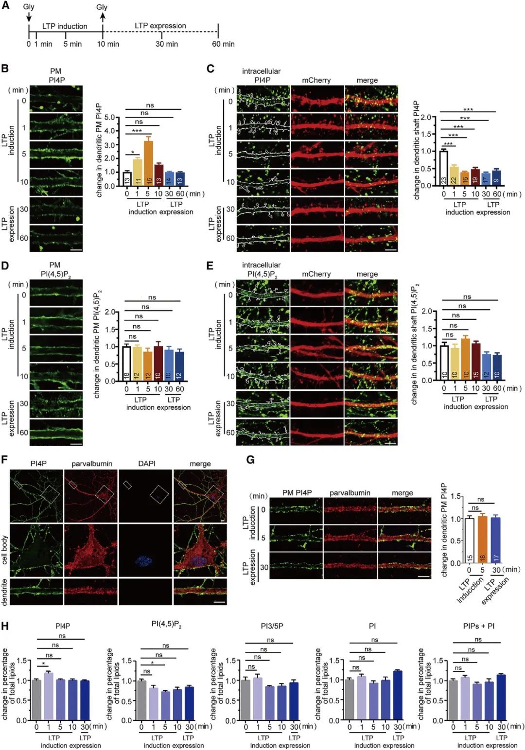 在中枢神经系统中,位于树突棘的突触后位点接收了大部分兴奋性输入。为了探索PI4P在突触传递和突触可塑性中的作用,作者首先研究了PI4P在树突中的亚细胞分布和含量是否会随着神经活动发生动态变化。在体外培养的海马神经元中,研究者借助NMDA受体的共激动剂(co-agonist)甘氨酸化学诱导细胞的长时程增强(long-term synaptic potentiation,LTP)效应。结果发现,树突的PI4P信号强度受神经元活动的调节,其水平在LTP期间经历动态可逆变化(图2)。