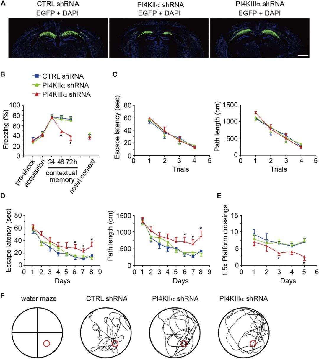 最后,作者借助情境恐惧条件反射和Morris水迷宫行为学范式发现,在海马CA1区沉默PI4KIIIa表达可导致小鼠记忆缺陷。提示了,海马CA1神经元中PI4KIIIa依赖的PI4P合成对于学习记忆是必需的(图6)。