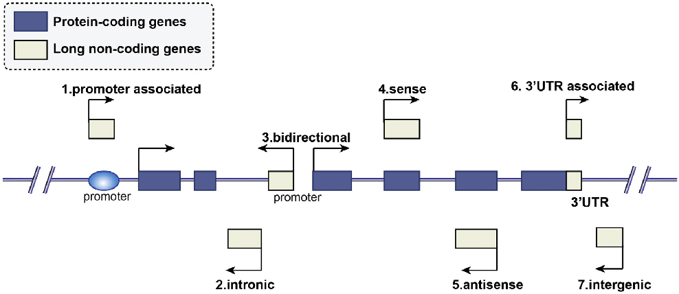 LncRNA根据其相对位置在调控靶编码基因中发挥重要作用,根据其在基因组上与编码基因相对位置的不同,可以将lncRNA分为以下几类(见图1):1.启动子区(来自启动子区域的转录本);2.内含子间(主要产生于编码基因的内含子区);3.双向(与蛋白质编码基因共享相同的启动子,但转录方向相反);4.正义链(转录方向与蛋白质编码基因方向相同,存在于同一编码基因正义链,具有重叠的外显子);5.反义链(转录方向与蛋白质编码基因方向相反,存在于反义链,至少有一个外显子重叠);6.3’UTR区(来自3’UTR区域的转录本);7.基因间(来自于两个蛋白质编码基因之间的DNA序列)。与mRNA类似,lncRNA也可以存在于细胞核或细胞质中,但主要位于细胞核。