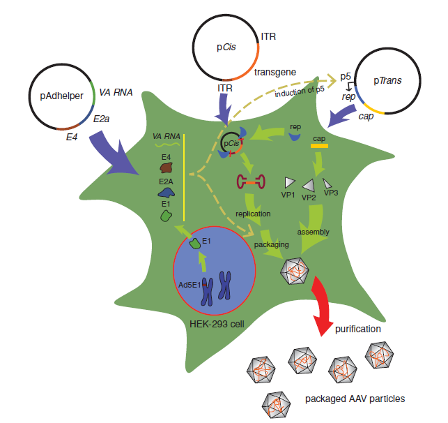 那么,能够高效、安全递送基因的rAAV是如何被生产出来呢?当下主流的生产系统有两种,一是利用经典的三质粒包装系统,瞬时转染人293细胞产生病毒;另一种即利用携带rAAV载体基因组、Rep蛋白和Cap蛋白的杆状病毒感染Spodoptera frugiperda(Sf9)昆虫细胞,从而产生rAAV病毒。这两种生产系统有何差异?实验和临床应用时,哪种效果更好?