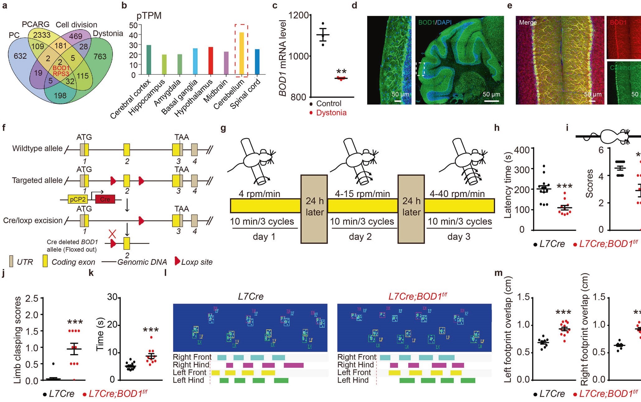 接下来,作者构建L7-Cre; BOD1f/f小鼠以确定特异性在浦肯野细胞中敲除BOD1基因对共济失调的影响。经多种行为学范式显示,L7-Cre; BOD1f/f小鼠出现共济失调样表型(图3f-m)。