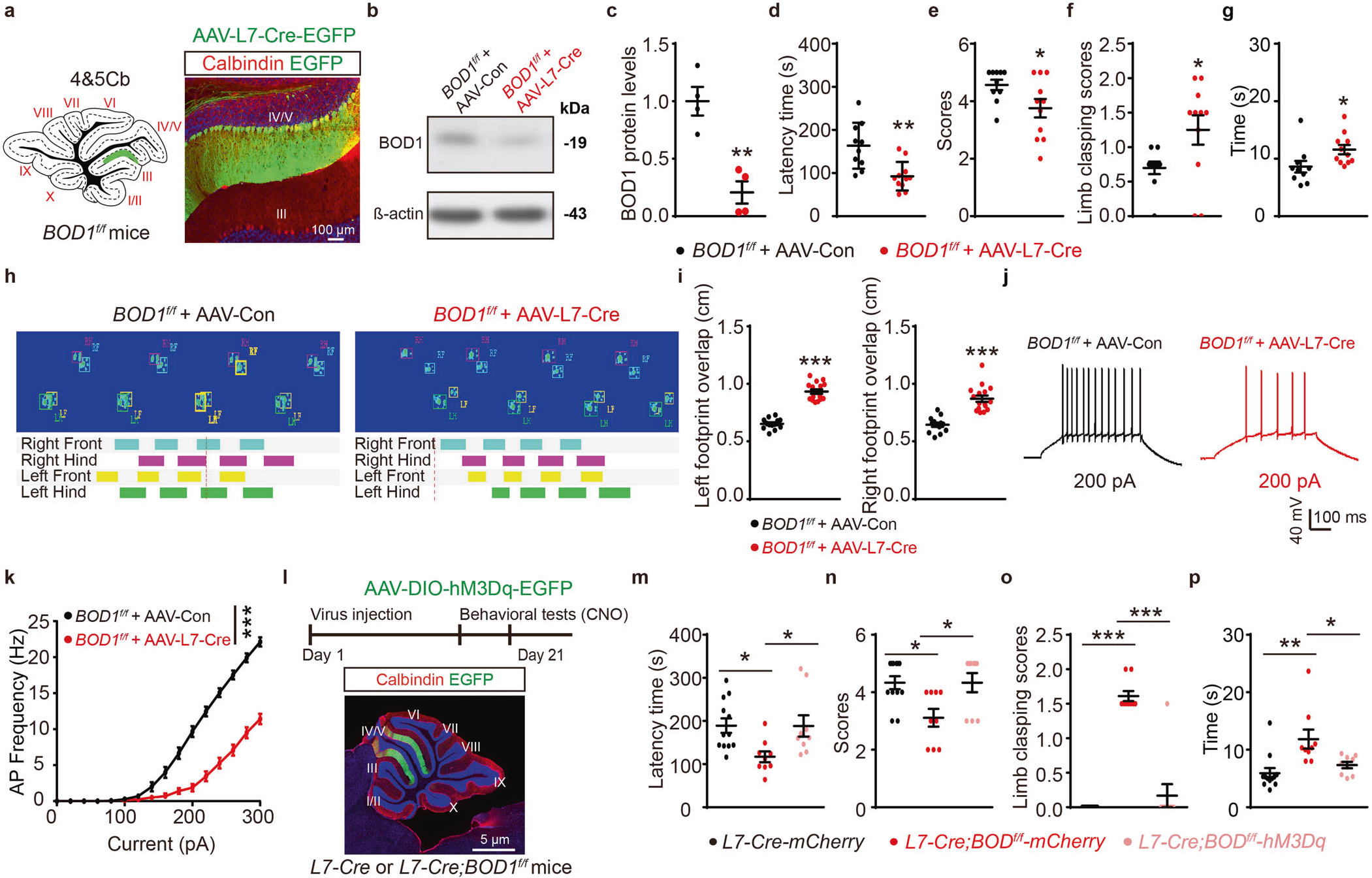 进一步,研究者借助AAV载体携带浦肯野细胞特异性启动子(AAV-L7-Cre-EGFP)条件性在小脑IV/V叶浦肯野细胞敲除BOD1,发现下调IV/V叶中BOD1的表达,可降低浦肯野细胞兴奋性,诱发小鼠表现出运动相关行为障碍(图4a-k)。