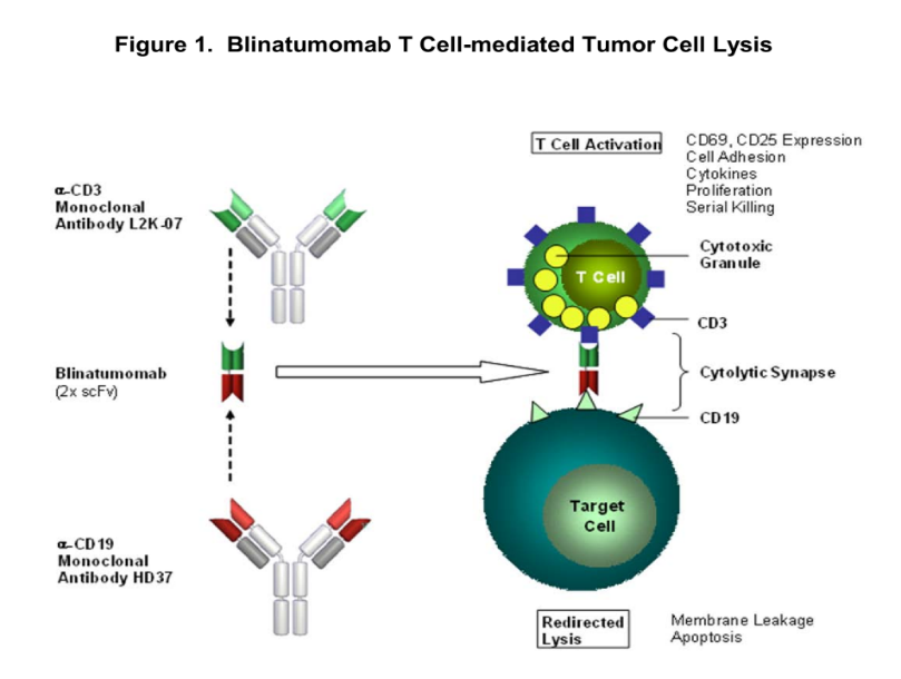 目前应用最成功的、针对肿瘤治疗的双抗药物是2014年美国FDA批准上市的药物Blinatumomab(Amgen公司),该双抗药物是抗CD19 及抗 CD3单链抗体可变区(scFv)组成的BiTE模式(Bispecific T-cell engager)双抗药物,适应症为复发或难治的前体B细胞急性淋巴细胞白血病(Precursor B-cell lymphoblastic leukemia)。